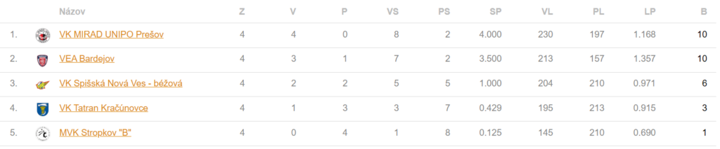 Výsledky 10. turnaj v Prešove (nehral VK MIRAD UNIPO Prešov „A“):