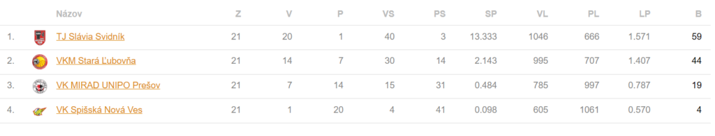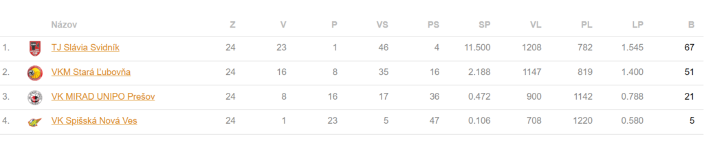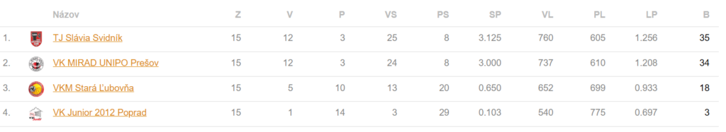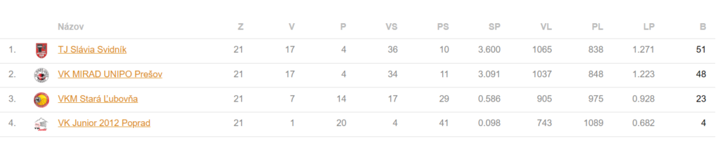 Aktuálne sa na druhom mieste v tabuľke nachádza VK MIRAD UNIPO Prešov „B“ a družstvo VK MIRAD UNIPO Prešov „A“ zastáva štvrtú priečku zo šiestich.